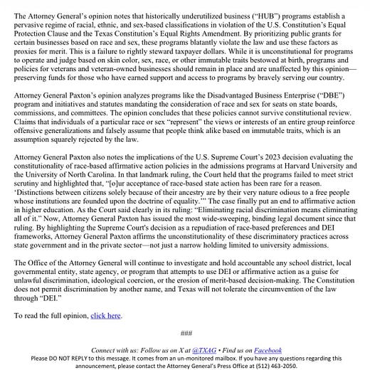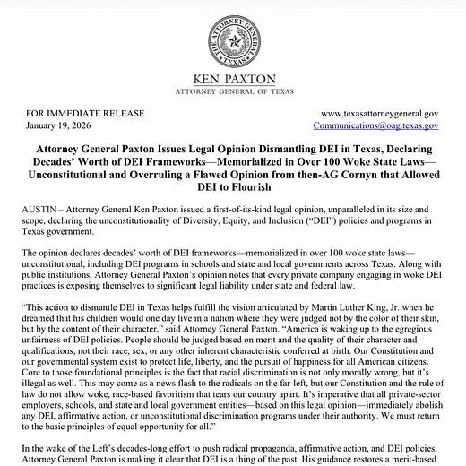 Yesterday, Attorney General Ken Paxton issued a legal opinion that notes that private companies engaging in DEI practices in Texas are exposing themselves to legal liability under state and federal law.