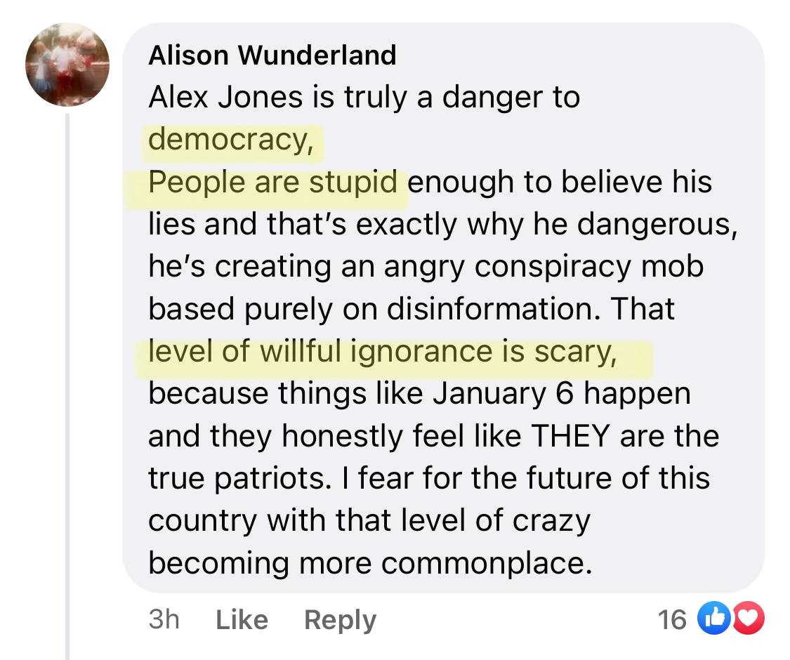 The demonization of Alex Jones and Infowars by the corporate media of their competition (Infowars) is like if Amazon or Walmart began to publicly demonize specific mom-and-pop retail store owners in an effort to crush their competition. Most people do not see it this way, despite this being the reality of this dynamic.