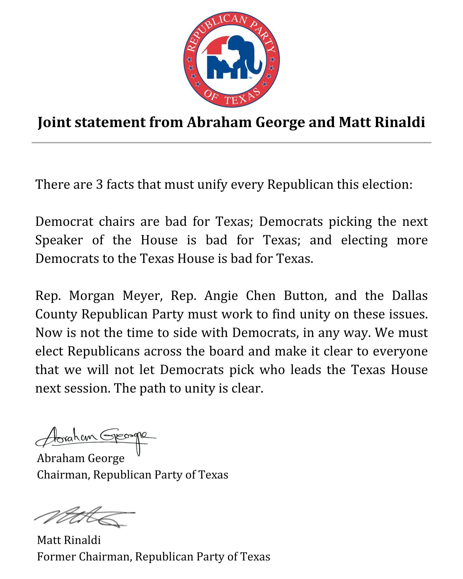 Even Matt Rinaldi and Abraham George, former and current chairman of the Republican Party of Texas, chimed in calling for unity and mentioning that nobody should be siding with Democrats.