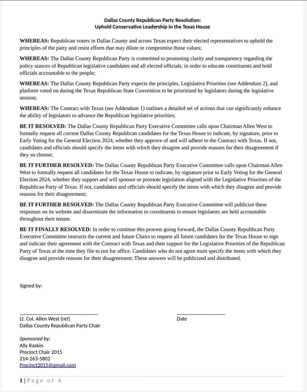 Individuals we spoke to from the committee meeting where this was voted on stated that Dallas County GOP Chair Lt Col Allen West was not part of the decision or creation of this resolution.