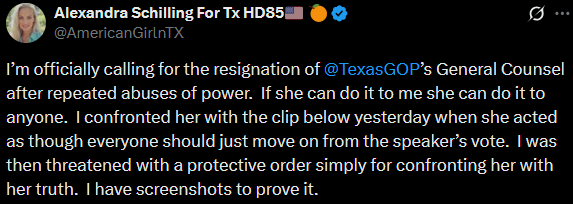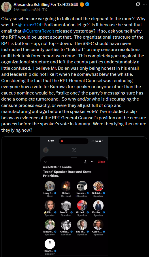 Alexandra Schilling, candidate for HD85, posted a recorded conversation (lot of that going on lately!) of an X Space where the censure process was discussed.