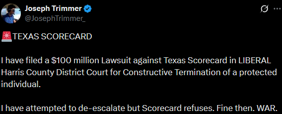 A former self-admitted bisexual reporter from Texas Scorecard is suing the media org for…well a bunch of things and he’s being very public about it on X.