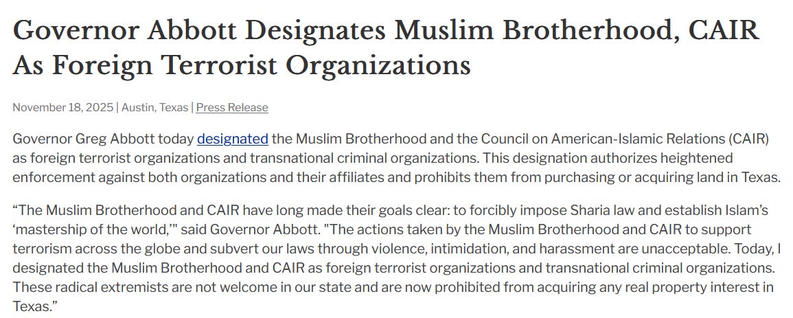 CAIR has been declared a terrorist organization by Texas Governor Greg Abbott, so this is pretty much a move by Austin City Council to spit in our Governor’s face.