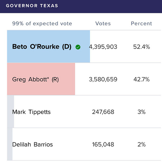 The "results" show Beto beating Abbott by ten points