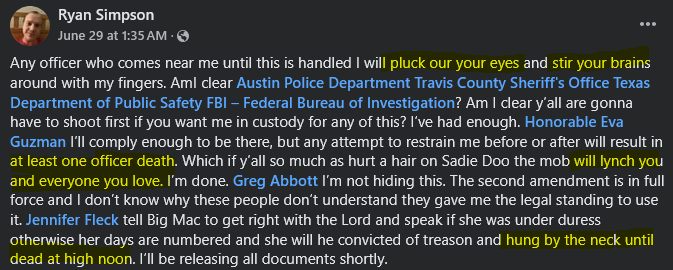 On April 27th, Simpson would post on Facebook confirming he was bipolar and that he took anti-psychotic medications. Simpson stated he tried to get into Austin City Hall with a knife. In the same post, Simpson also mentions he once entered the Capitol with “a foot long nail.” Simpson’s post says his family makes sure he doesn’t have access to a gun because they are concerned he would hurt himself.