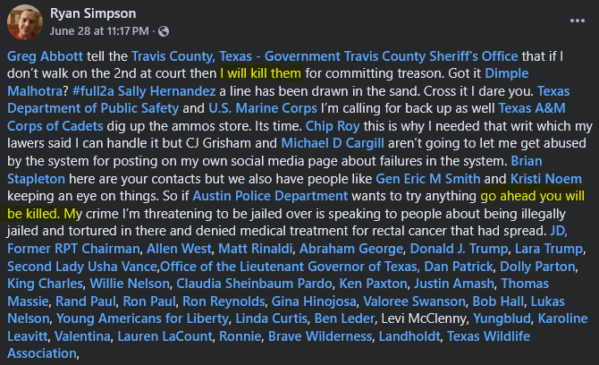 Court records show the DPS investigator found several instances of violent threats where Simpson tagged Travis County Court #4 Judge Dimple Malhotra, Texas Gov. Greg Abbott, and many other government and law enforcement officials on Facebook.