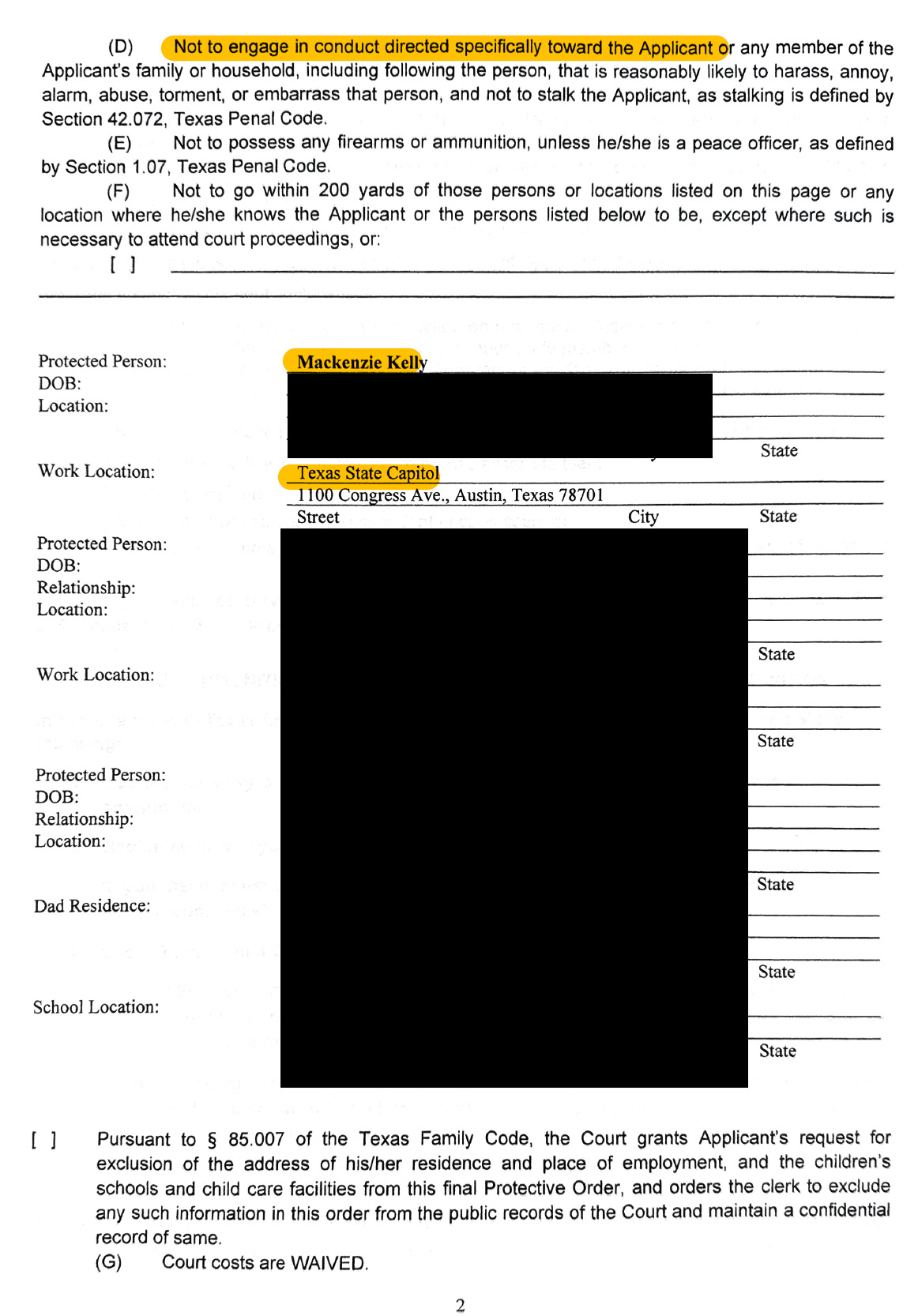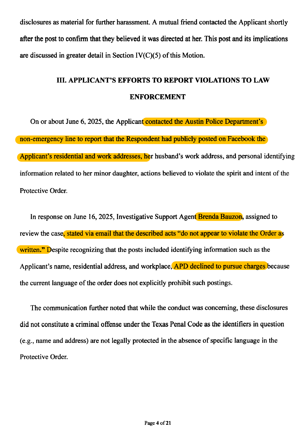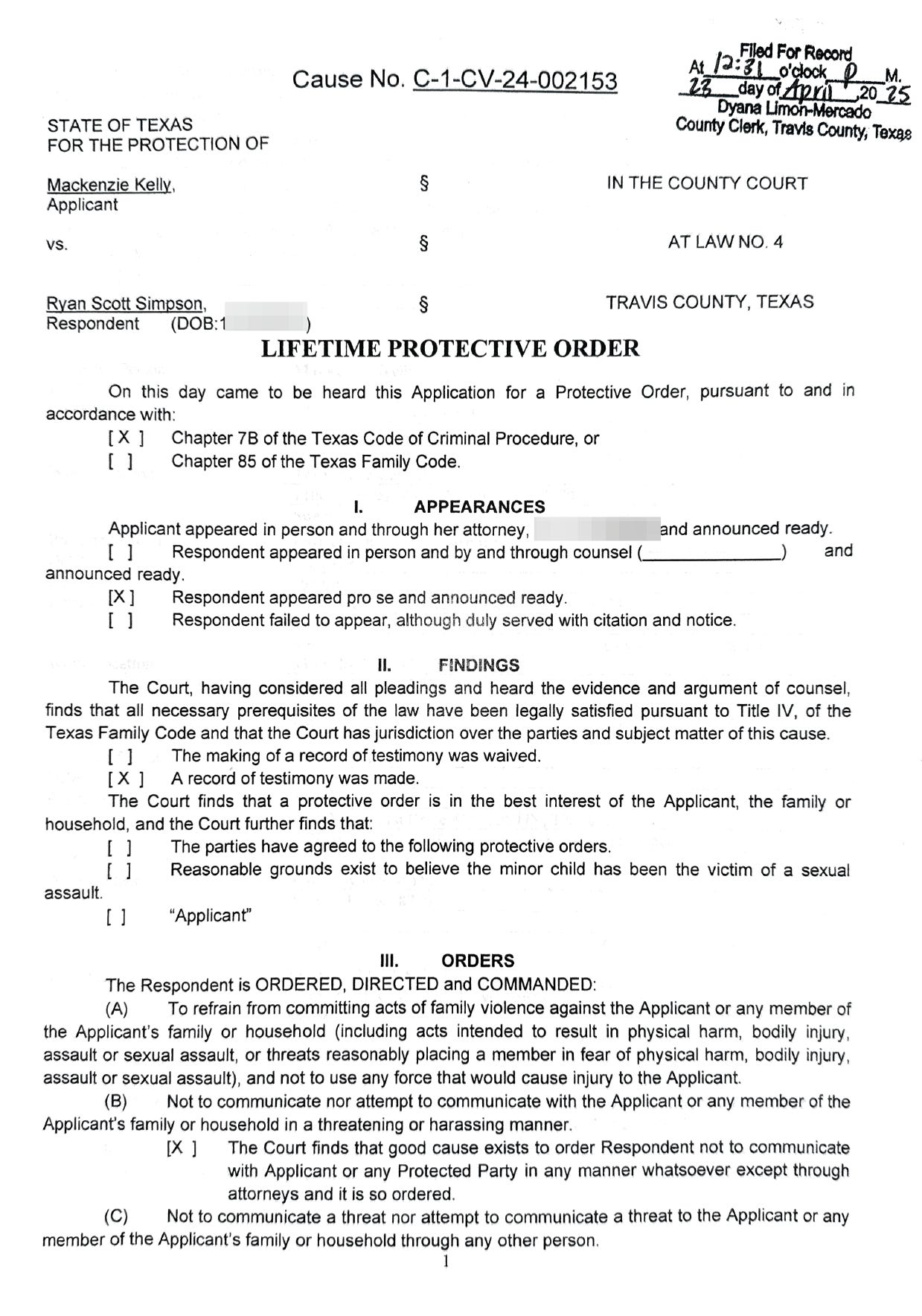 Kelly would respond by filing a motion for contempt against Simpson. In the motion, Kelly documents her efforts to inform Austin Police about Simpsons violations. Ten days after she reported these violations, Austin PD would dismiss her concerns.