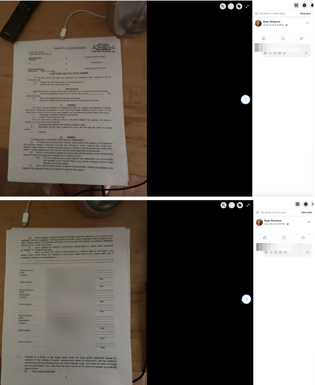 Simpson would then allegedly violate the protective order filed against him by Kelly by uploading her address, and child’s full name, address, and school location to his Facebook page completely unredacted.