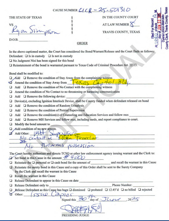 Years of documented harassment, and admitted mental disorder, and public posts that allegedly violated protective orders were all ignored by the Austin Police and courts until Simpson finally crossed a line by threatening government officials.