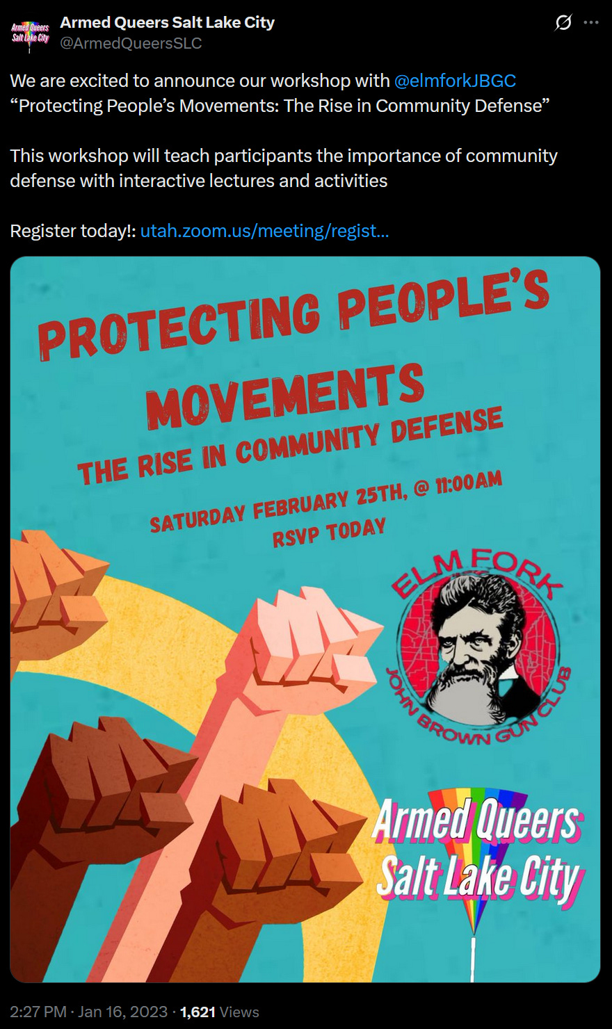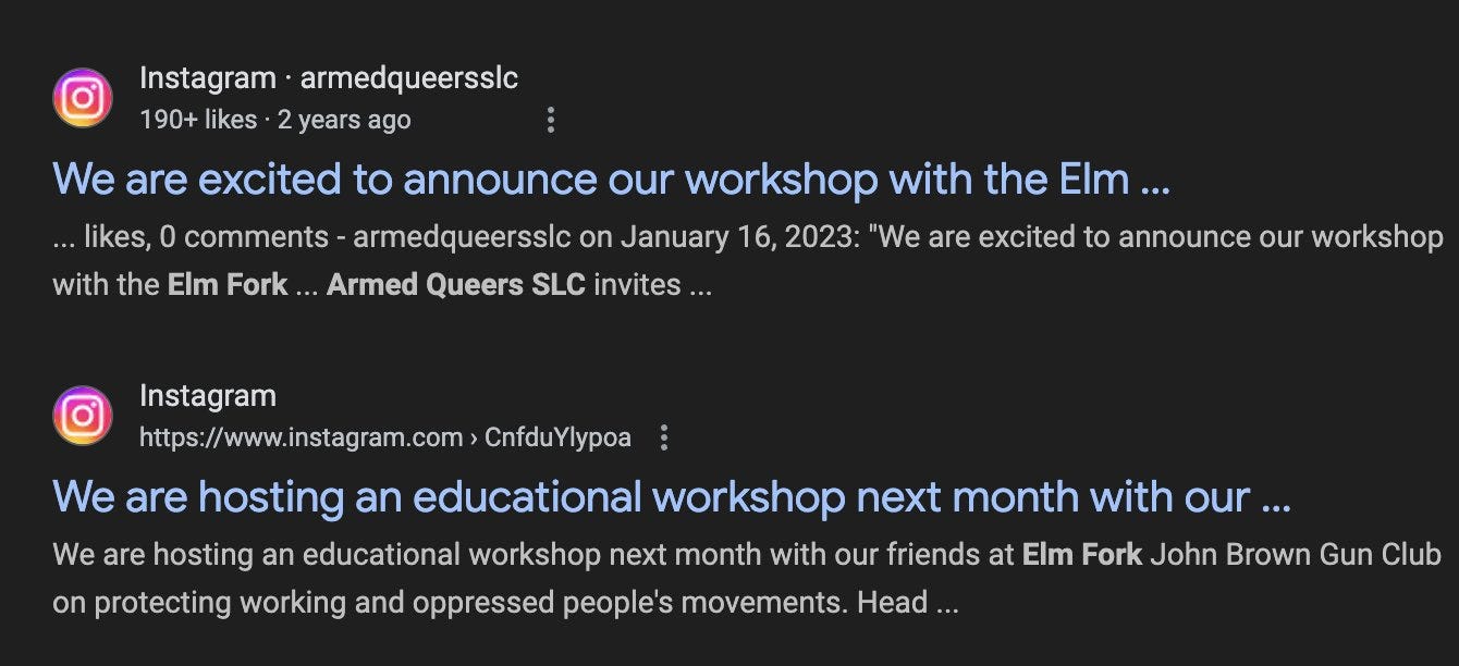 In now deleted Instagram posts belonging to Armed Queers SLC, two years ago the group hosted an event with Elm Fork John Brown Gun Club.