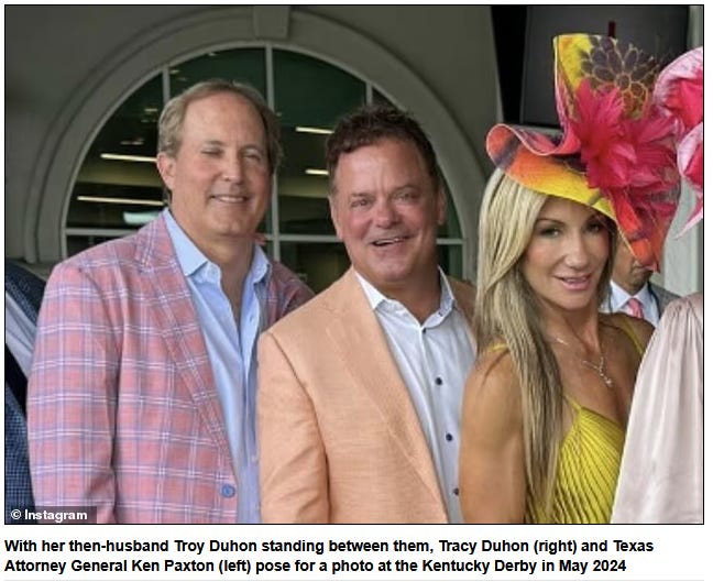 DailyMail alleges that Ken Paxton and Tracy Duhon began their affair after meeting at the Kentucky Derby in 2024. DailyMail’s reporting states the two took multiple trips across the country and overseas.