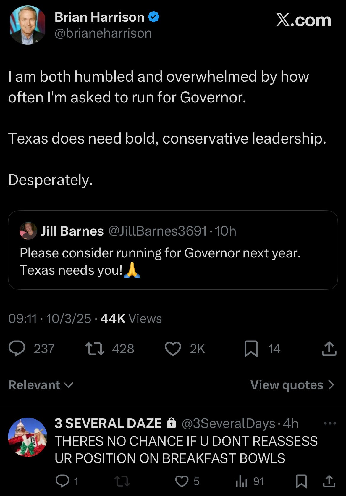 State Rep. Brian Harrison, notable for trying to pass LGBTP-priority legislation, hinted several times at a potential run. He retweeted and responded to a devout follower’s post asking him to run for governor. Harrison has cultivated quite the following on social media, with some seeing him as the sole conservative in the Texas House.