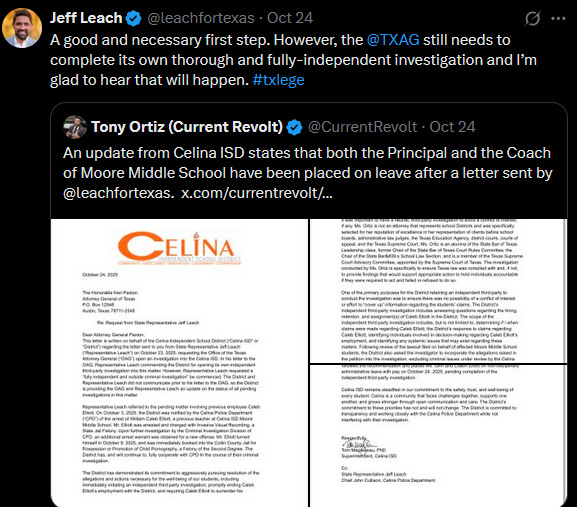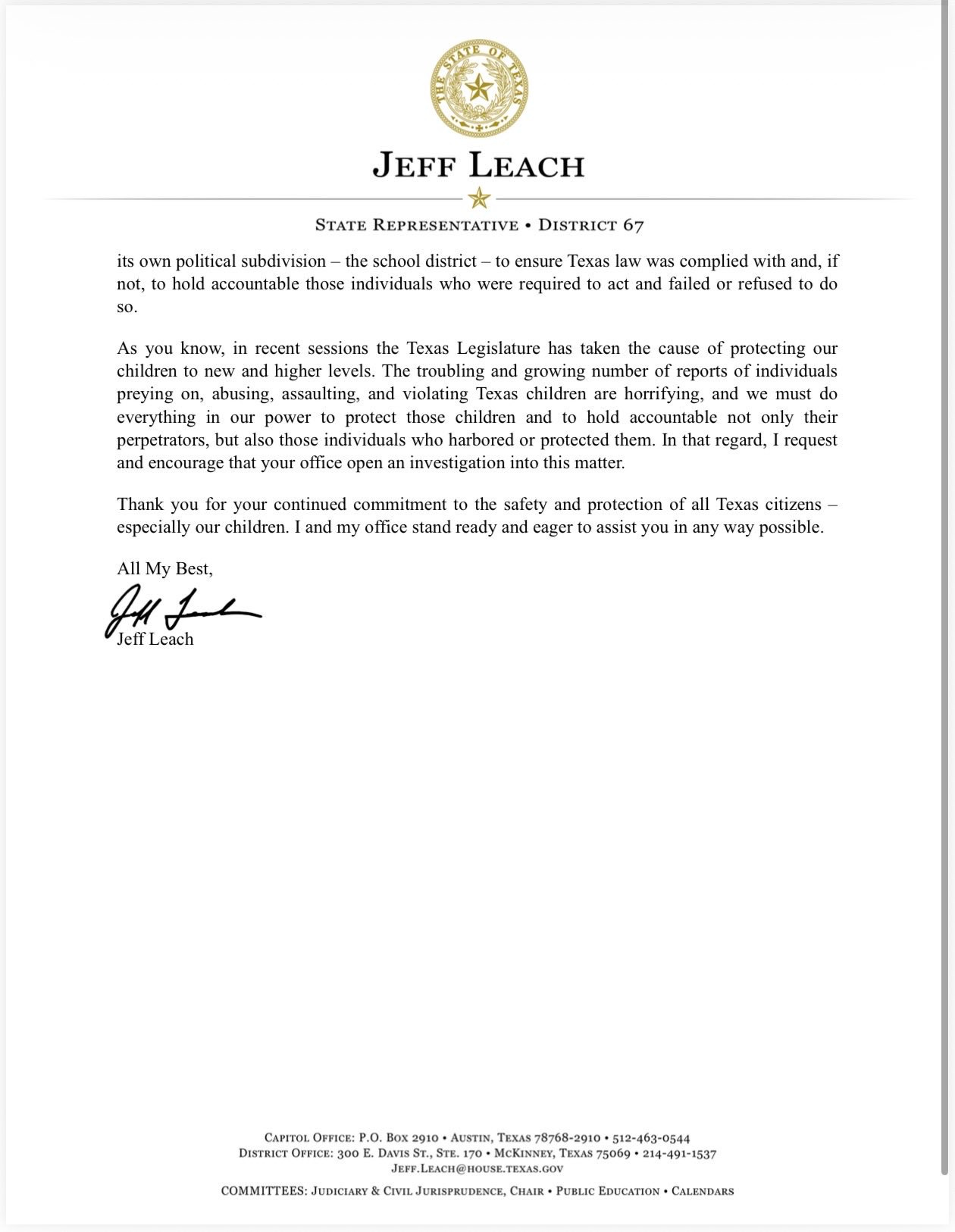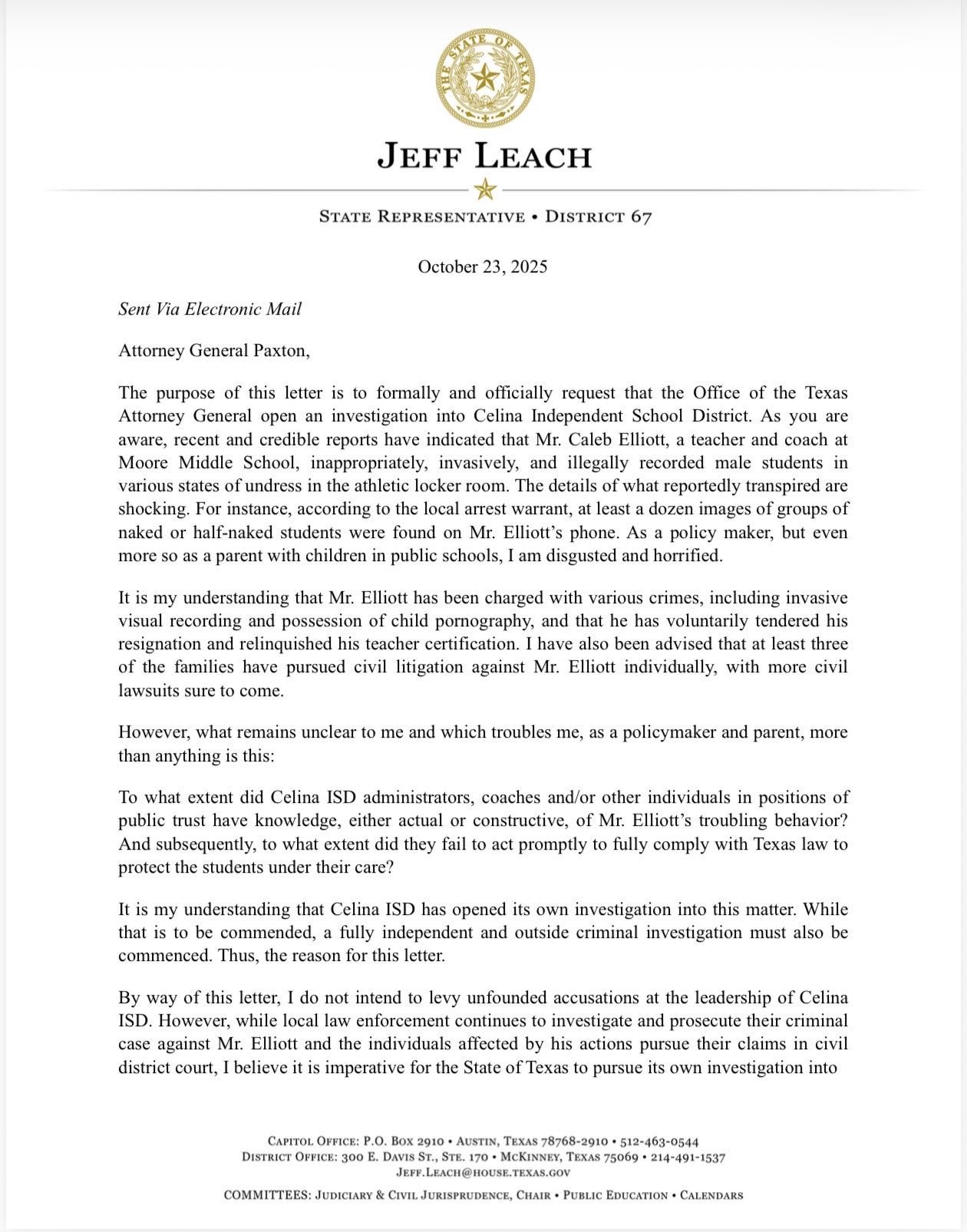 Representative Leach then sent a letter to Attorney General Ken Paxton on October 23rd asking for an independent investigation into the incident.