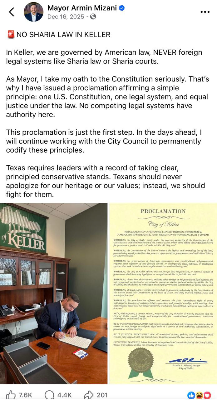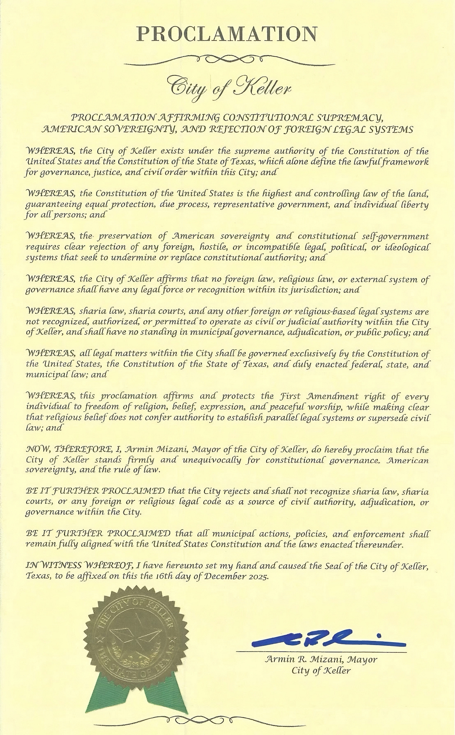 The city of Keller made headlines after Mayor Armin Mizani issued a proclamation declaring that sharia law would not be permitted in the city, signaling that further official action was forthcoming.