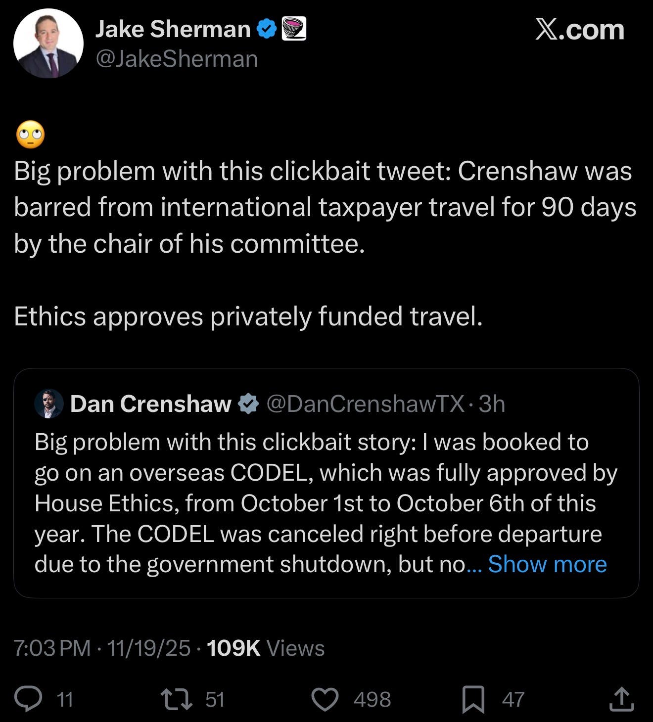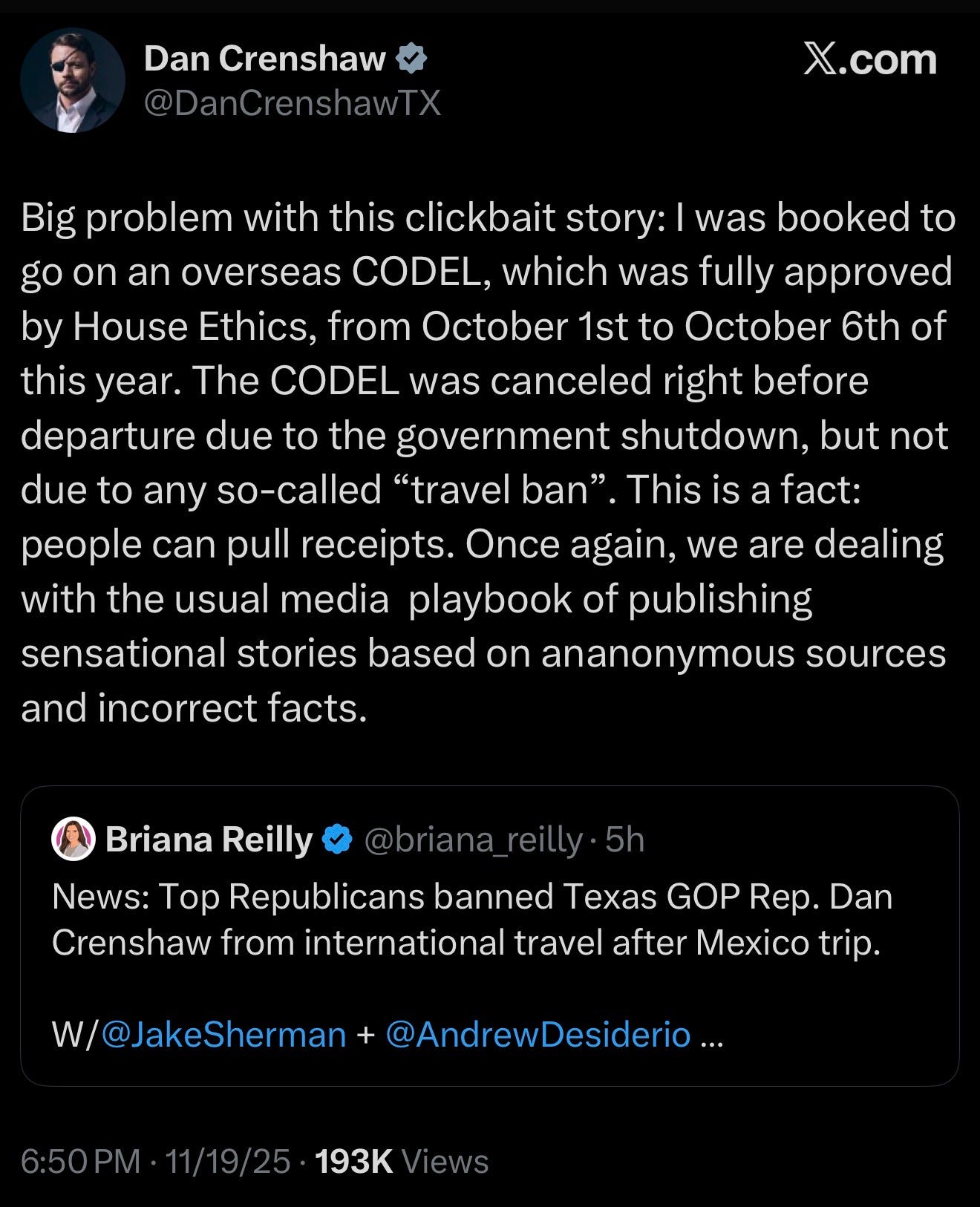 On Wednesday, Punchbowl News reported Congressman Dan Crenshaw was barred by senior House Republicans from international travel after an incident involving Mexicans, alcohol, crude jokes, and women.