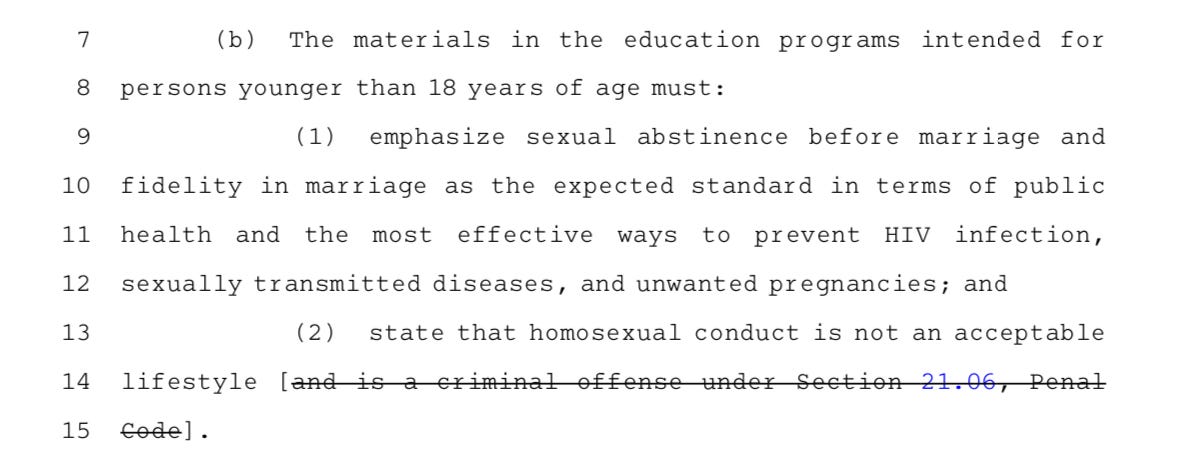 The bill also updates the Health and Safety Code meant for children under 18. The program will maintain its stance that “homosexual conduct is not acceptable”—for now—but the program will delete the instructional language informing children that it’s illegal.