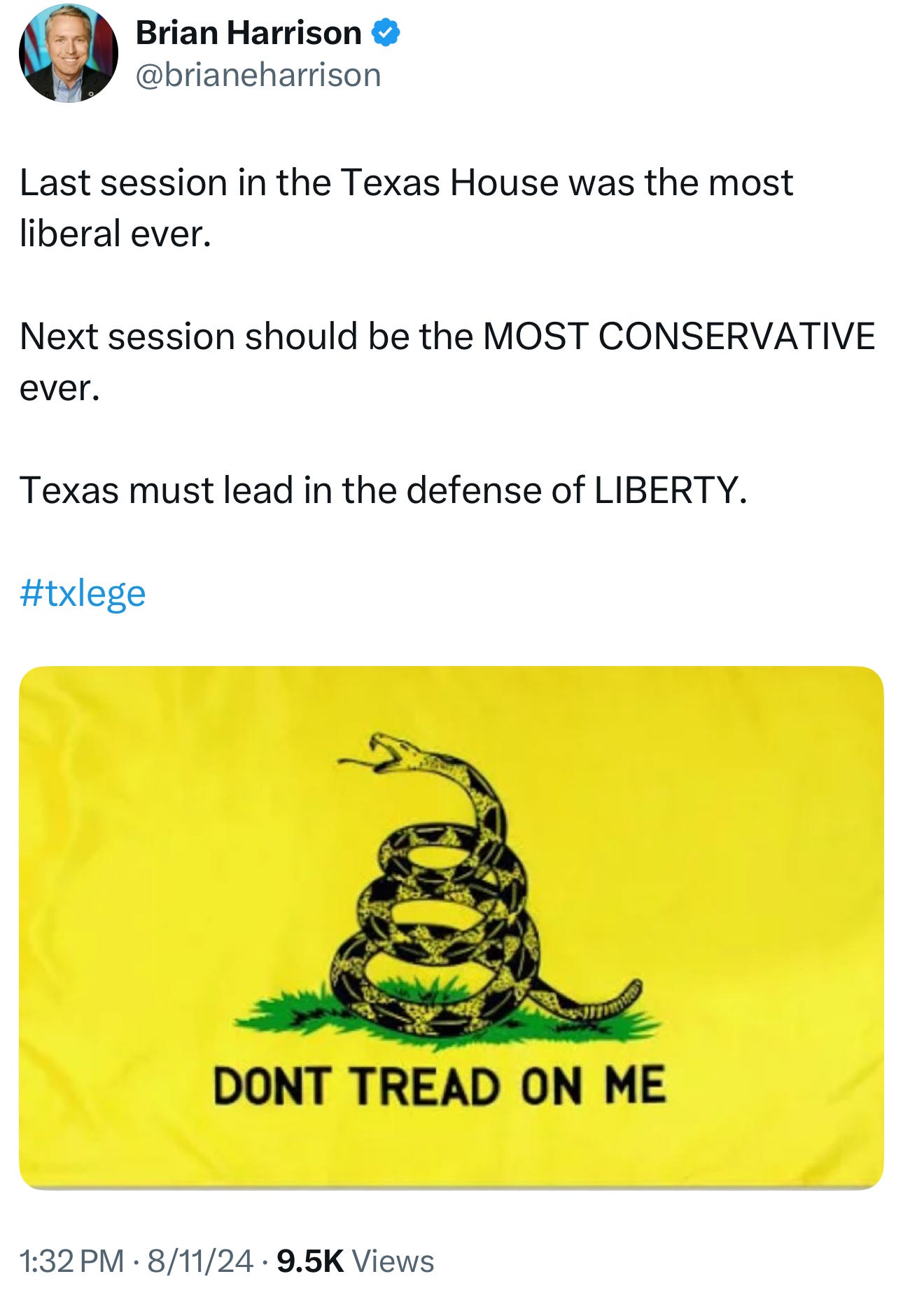 Harrison recently said he was working to make the Texas government the most conservative in America.