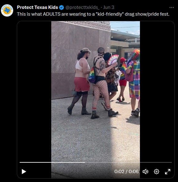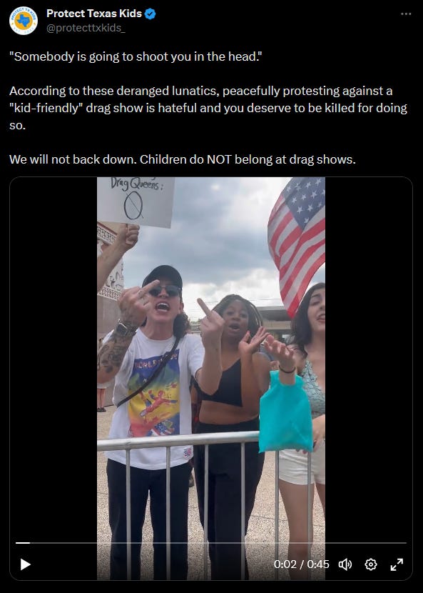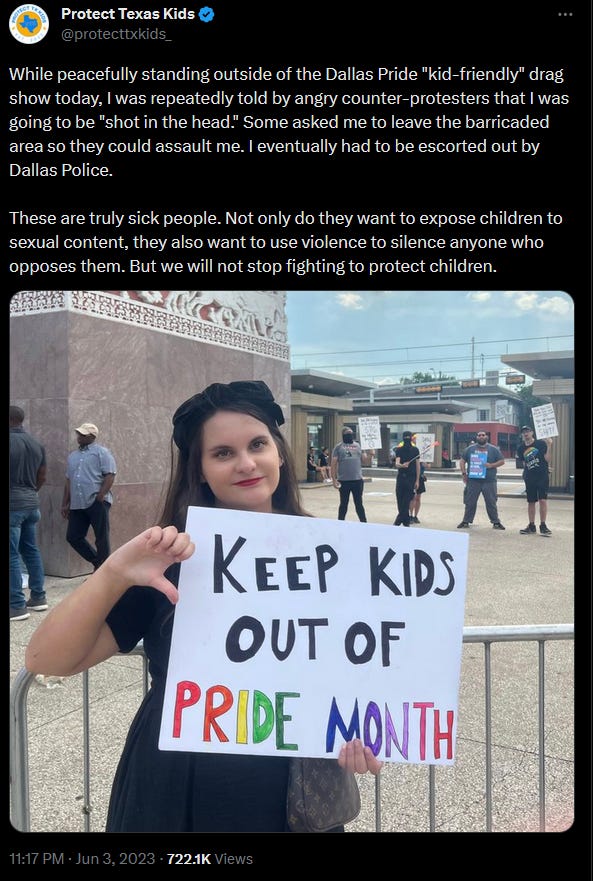 One group is Protect Texas Kids (PTK), who actively protested at Dallas Pride’s most recent event, which was a “kid-friendly” drag show.