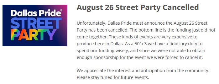 Dallas Pride announced they had to cancel their August 26th “Street Party” due to a lack of funding. This is unsurprising to anyone who has seen the types of gross things that happen at these events.