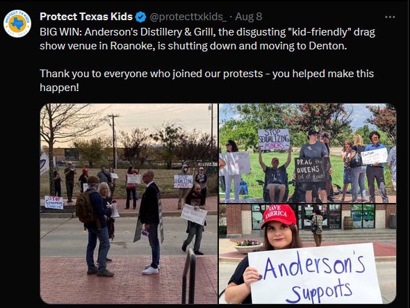 Neidert of Protect Texas Kid scored another win when her protests led to a distillery being forced to shut down and move away after hosting a “kid-friendly” drag show.