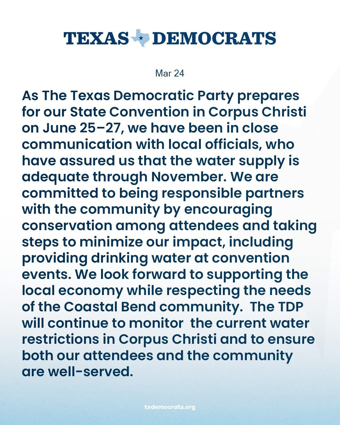 If the last state Democrat convention is any indicator, while delegates will ignore aquatic guidelines, it’s unlikely they’ll seriously impact Corpus Christi’s water supply. These events tend to be eerily empty; no word on if there’s a furry gathering like at a previous Texas Democrat convention.