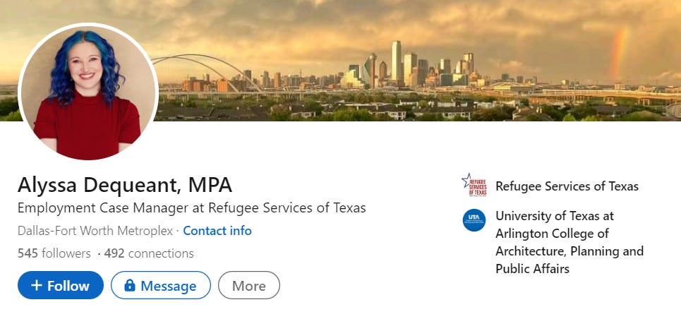 Last we reported, Collin County’s District Clerk race was a lock for Republican Mike Gould. Alyssa Dequeant - blue haired, blue wave wannabe - dropped out of the race and now helps “refugees” get jobs according to her LinkedIn.