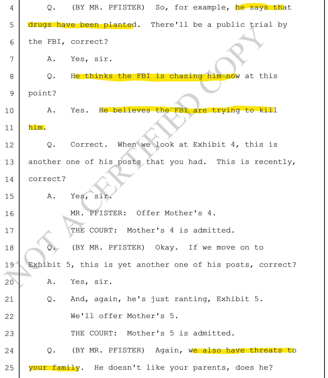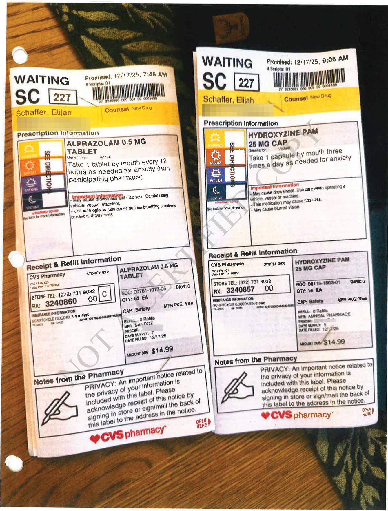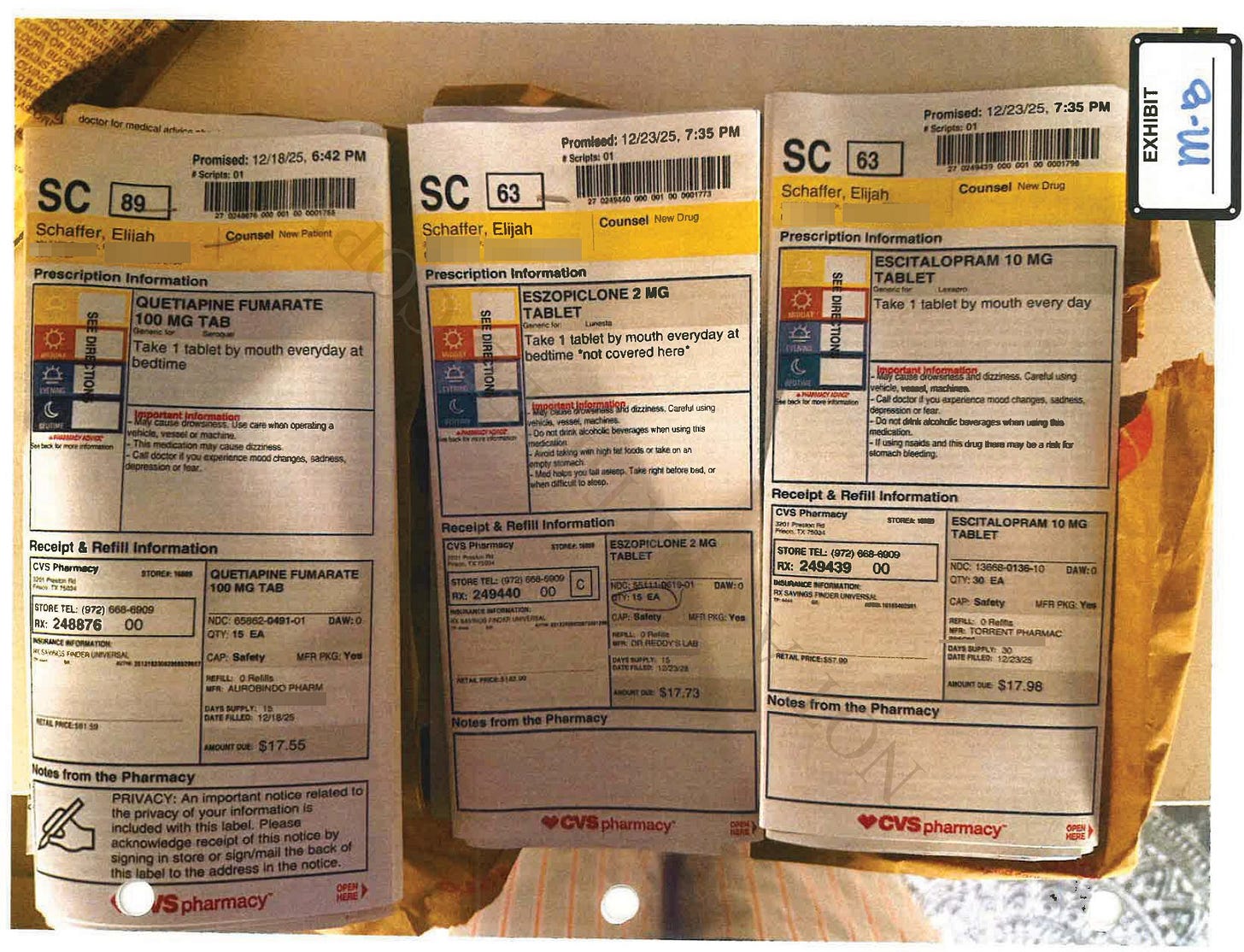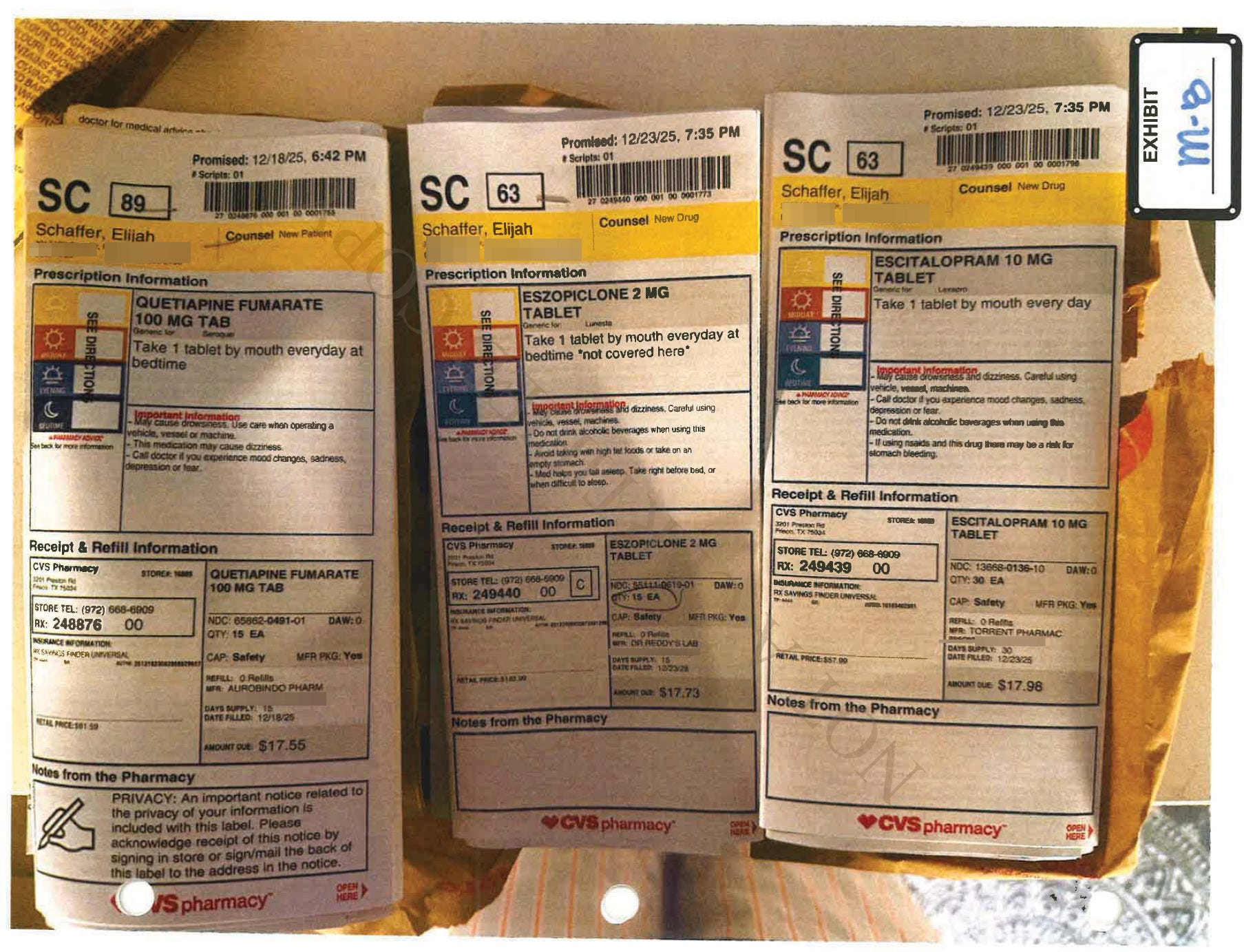 Schaffer’s wife also states that Elijah has been diagnosed as “manic” and that a psychiatrist prescribed “schizophrenic medication.”