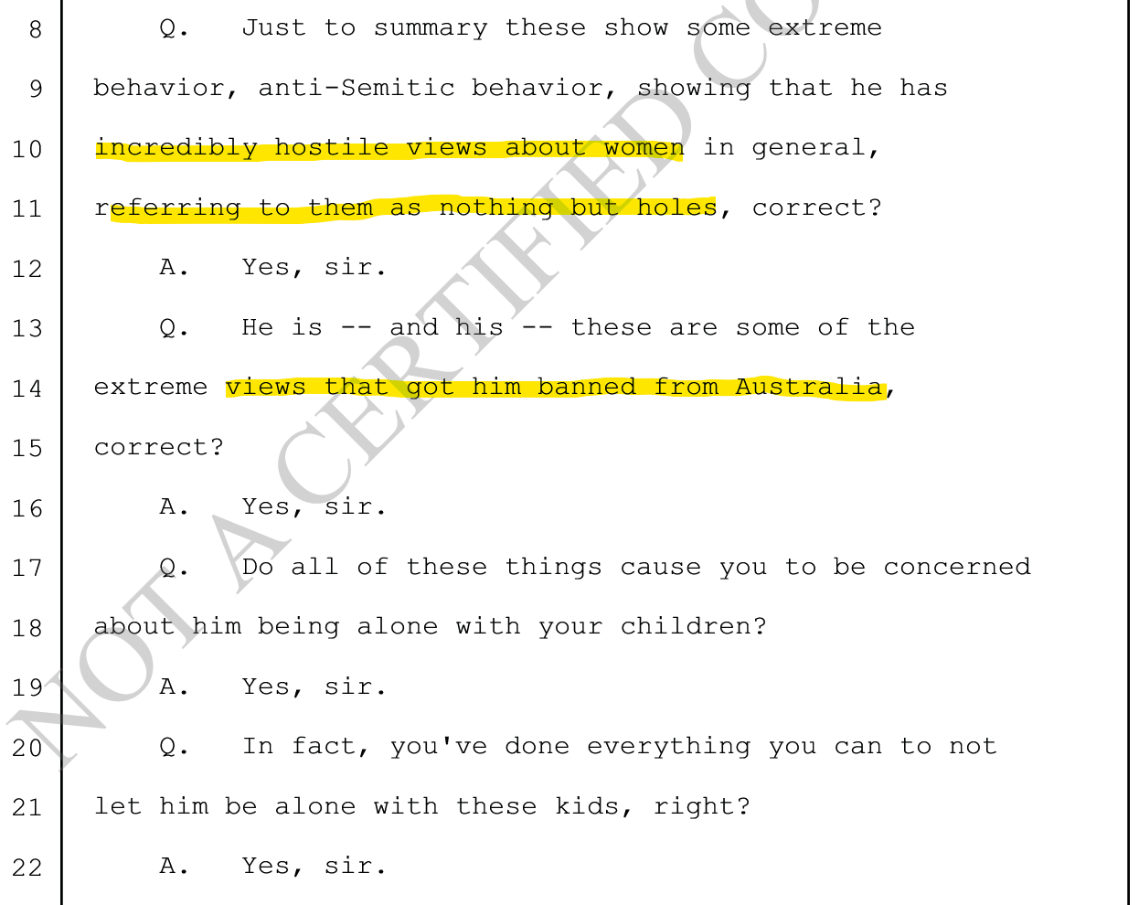 In the transcript, Schaffer’s wife alleges that some of his extreme views got him banned from Australia: