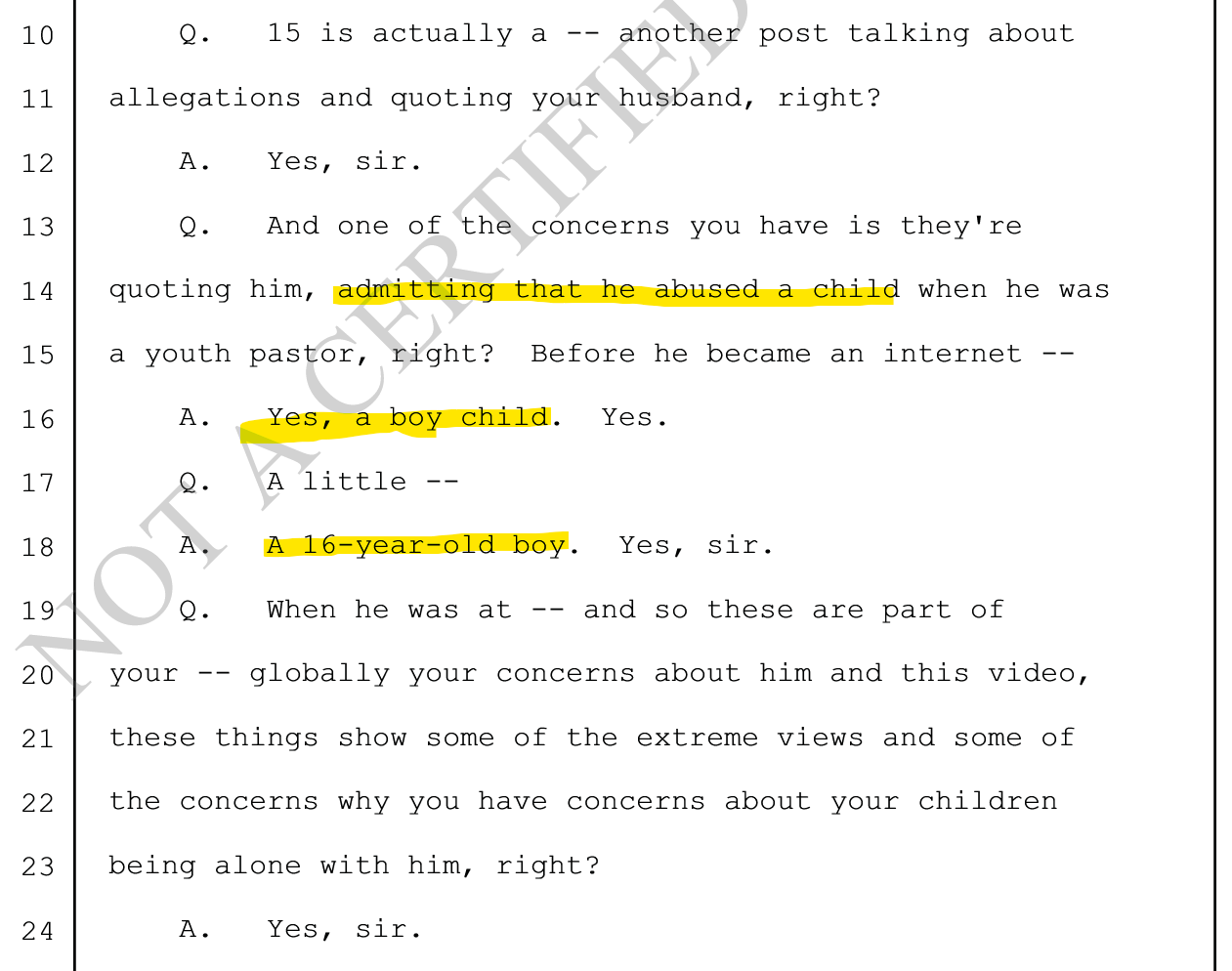 In a transcript regarding a temporary restraining order, Schaffer’s wife testifies that Elijah admitted to abusing a 16-year-old-boy when he was a youth pastor: