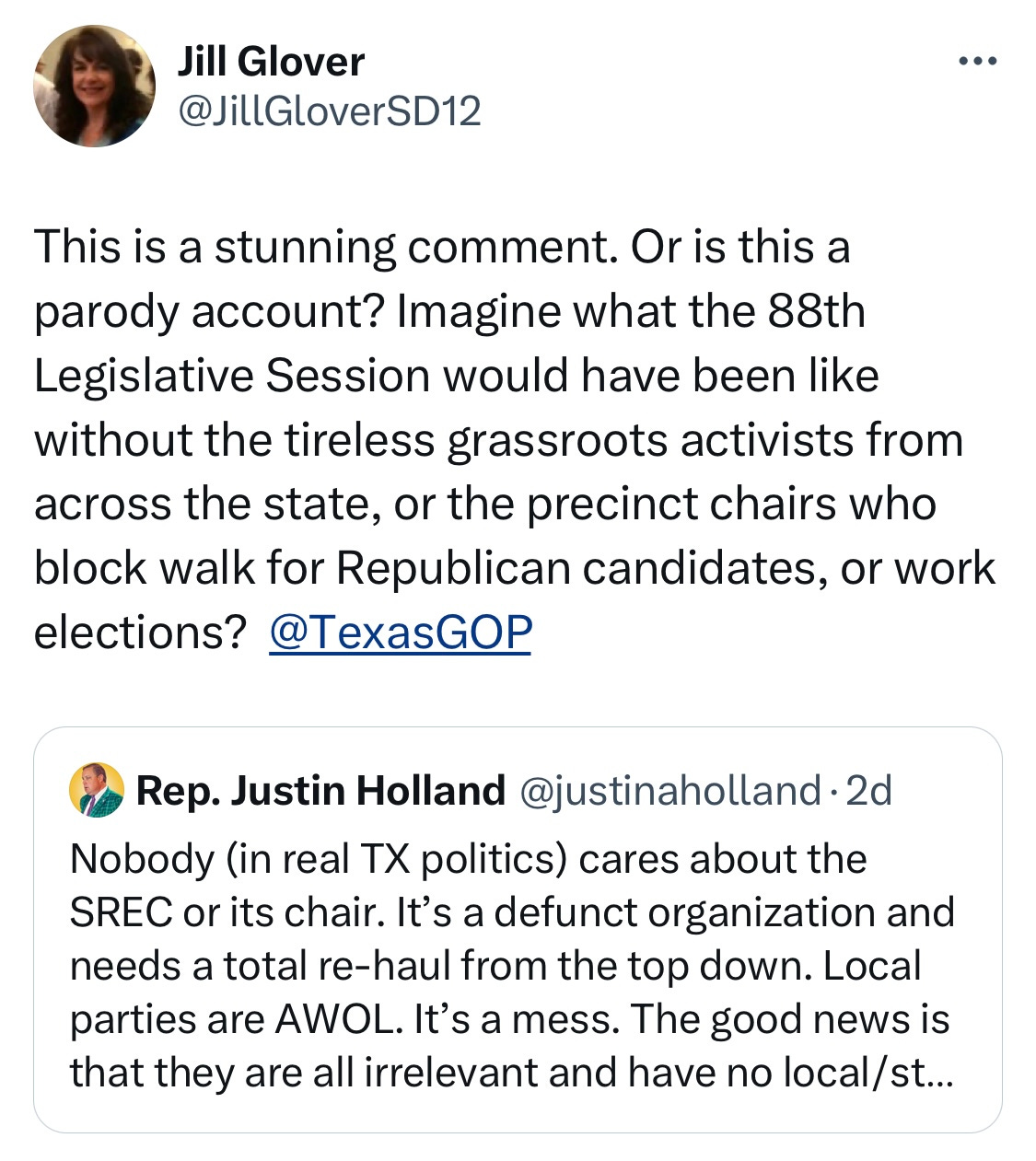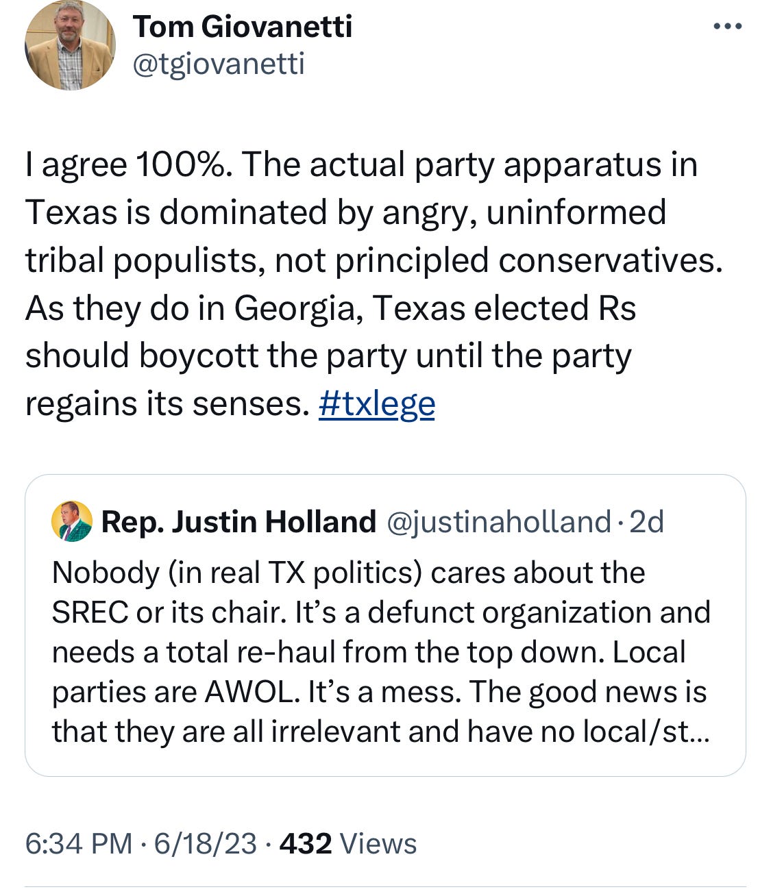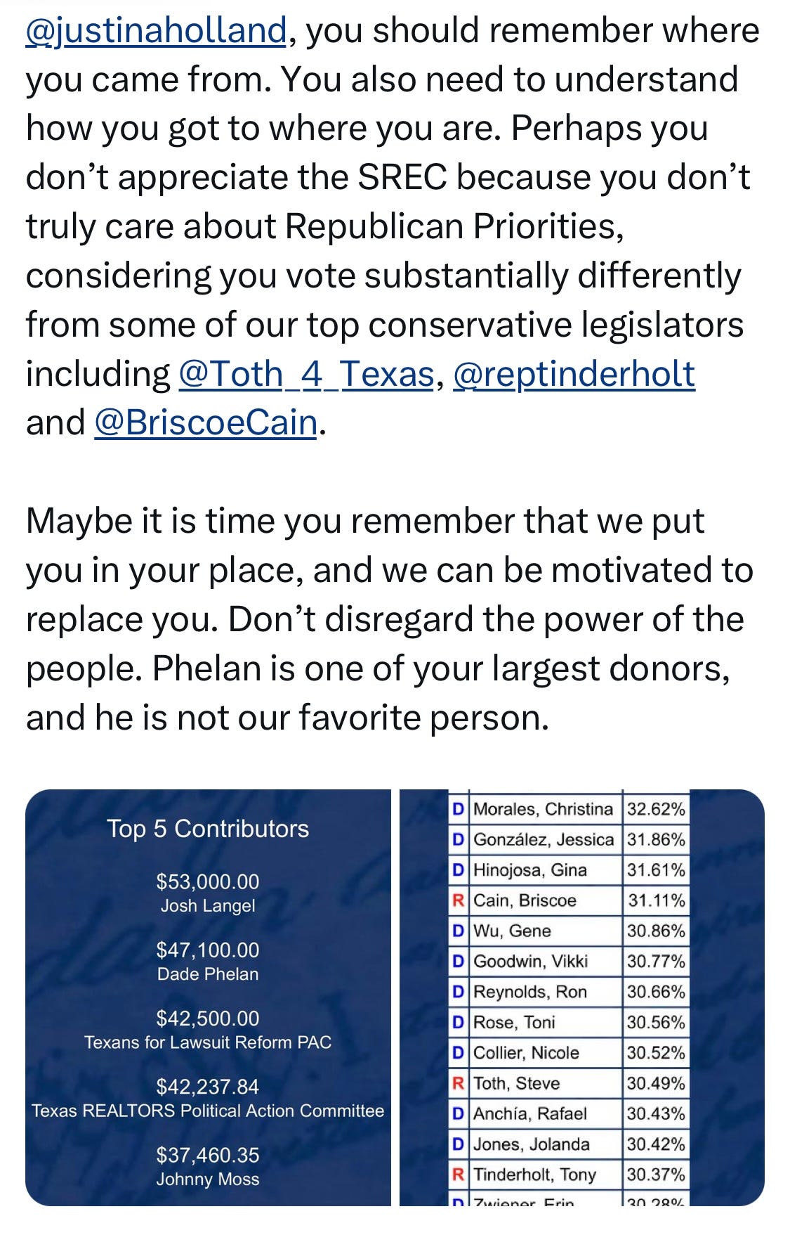 These guys never disclose that they have accepted massive campaign contributions from one side of this GOP civil war that would seem to create a conflict of interest in how they vote. Holland has taken a bunch of money in from Phelan, so when he sides with Phelan in the Phelan/Abbott feud against Paxton/Patrick, pretending that you are taking a stance purely out of principle is condescending to voters.