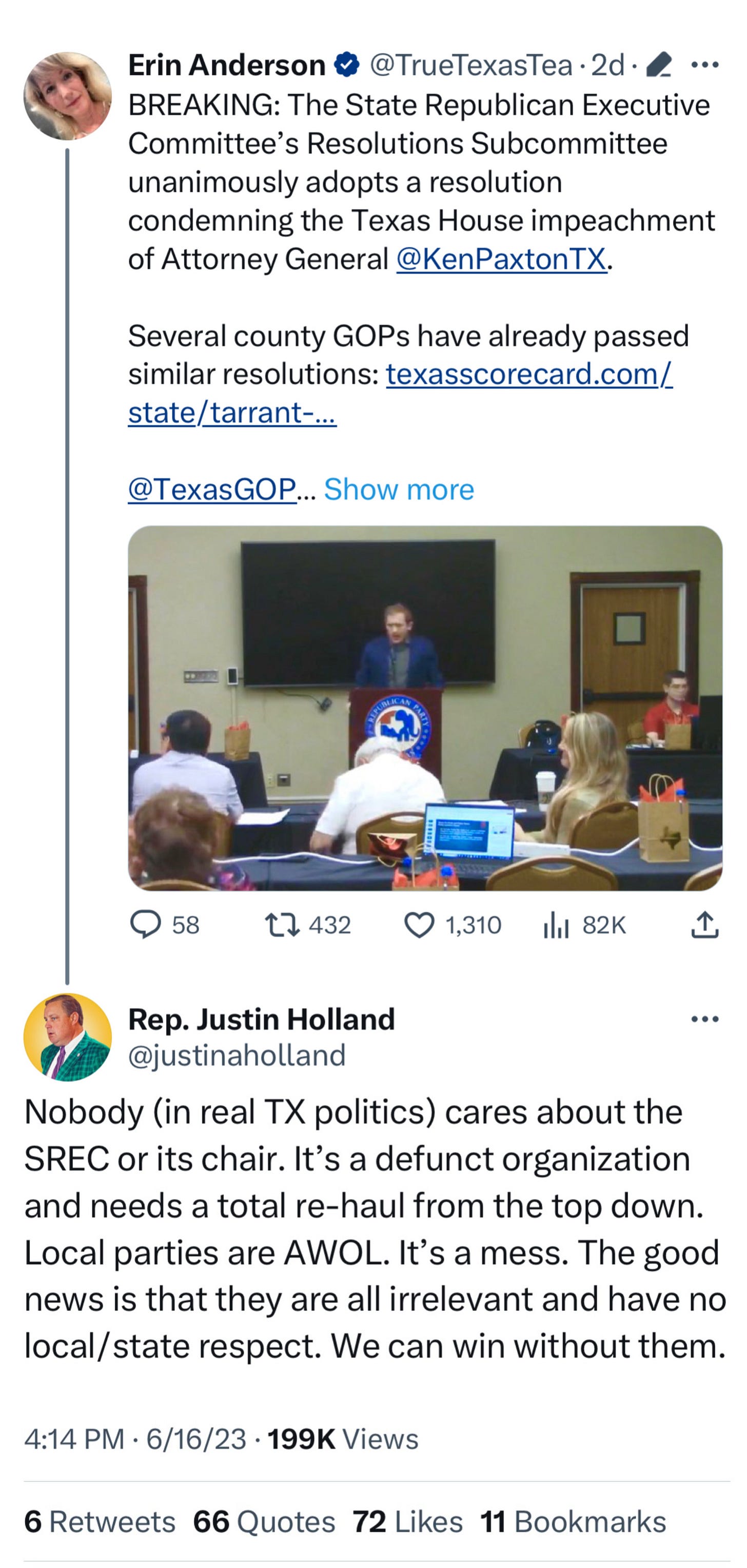 Holland says that top party leaders who volunteer their time and effort towards trying to stop the decline of our country are “irrelevant and have no respect” because they support Ken Paxton and don’t appreciate him being impeached by his own party.