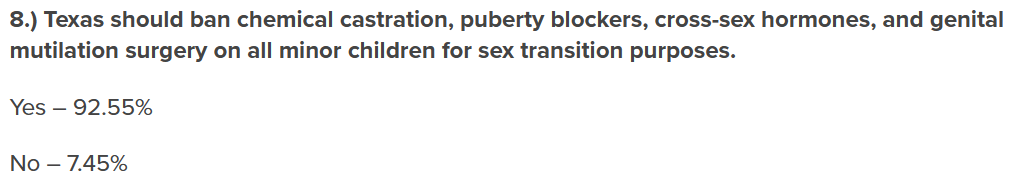 The rank and file of Texas GOP hate the trans movement and its child mutilation. It defiles young children and subsequently destroys of their lives. Almost all Texas Republicans want to behave in a Christlike manner when confronted with it.