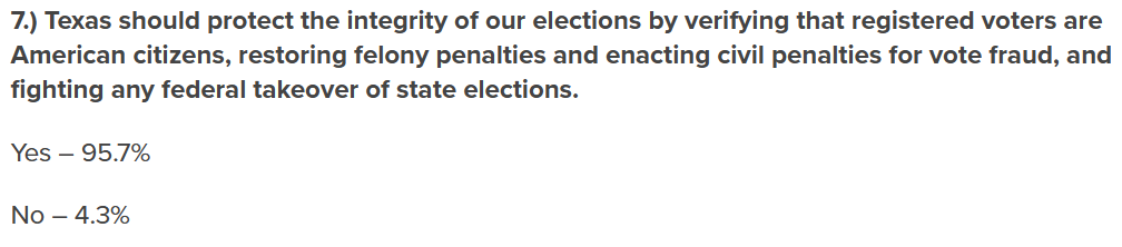 Rank and file overwhelmingly support tight election standards and preventing federal “fortifying” efforts. As usual, state autonomy in the face of federal overreach is the most Texan approved position.