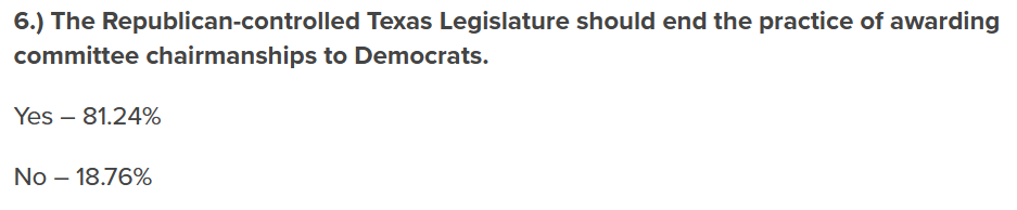 The whole thing is worth looking at and it’s very reassuring. No, you are not alone. No, you are not going crazy. Most of your current political leaders have been bought by greedy corporate interests and are desperately trying to prove themselves to their leftist peers in Austin and Washington D.C.
