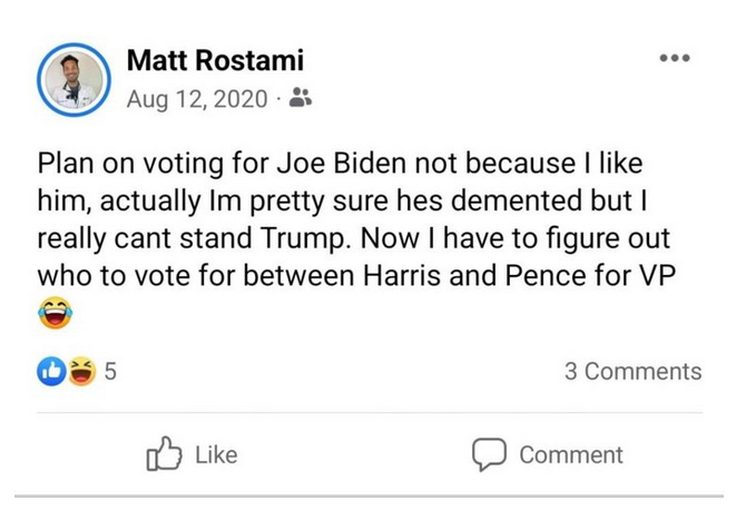 This is despite overwhelming evidence that’s shown Rostami has not only voted for Democrats, but has also donated thousands of dollars to Democrat politicians.