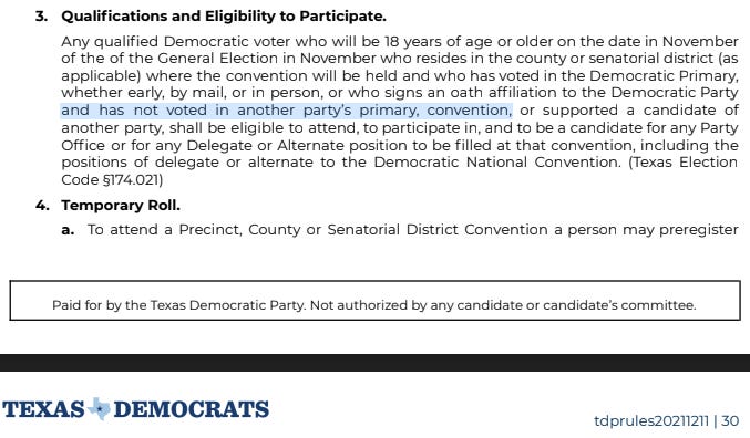Even the Texas Democratic Party has stricter rules on who they allow to become precinct chairs.