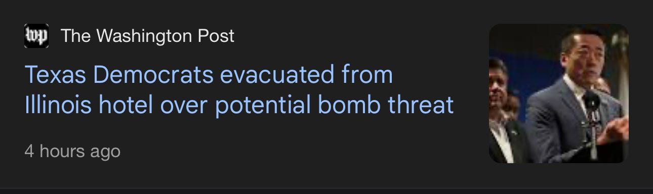 Only the second day after fleeing to Illinois, the state known for its “common sense” gun laws, Texas Democrats were quickly greeted with a bomb threat.