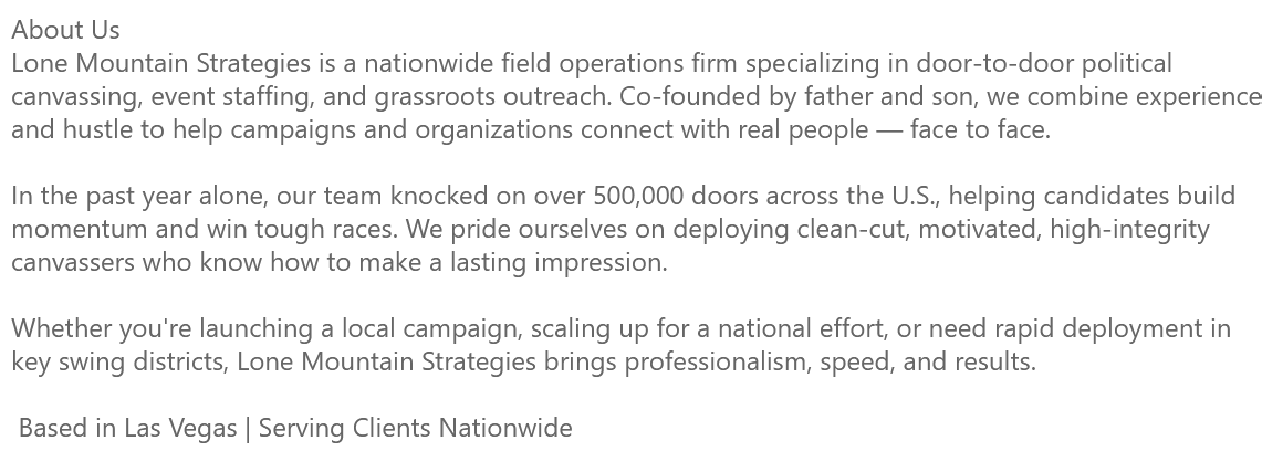 The company behind the paid poll greeting is Lone Mountain Strategies, a Las Vegas (hmm) based company that deploys block walkers and political canvassers across the country.