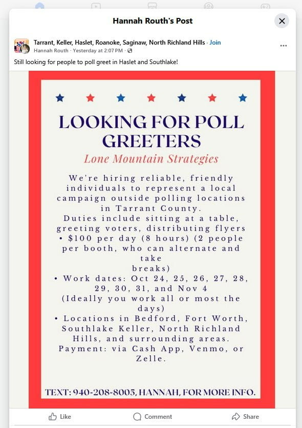A video posted on Facebook from Keller Town Hall, people taking paid poll greeter gigs from the Huffman campaign are struggling with poll greeting.