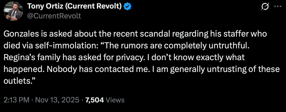 At TribFest this weekend, Congressman Tony Gonzales was asked about the scandals surrounding him and the death of his staffer who self-immolated.