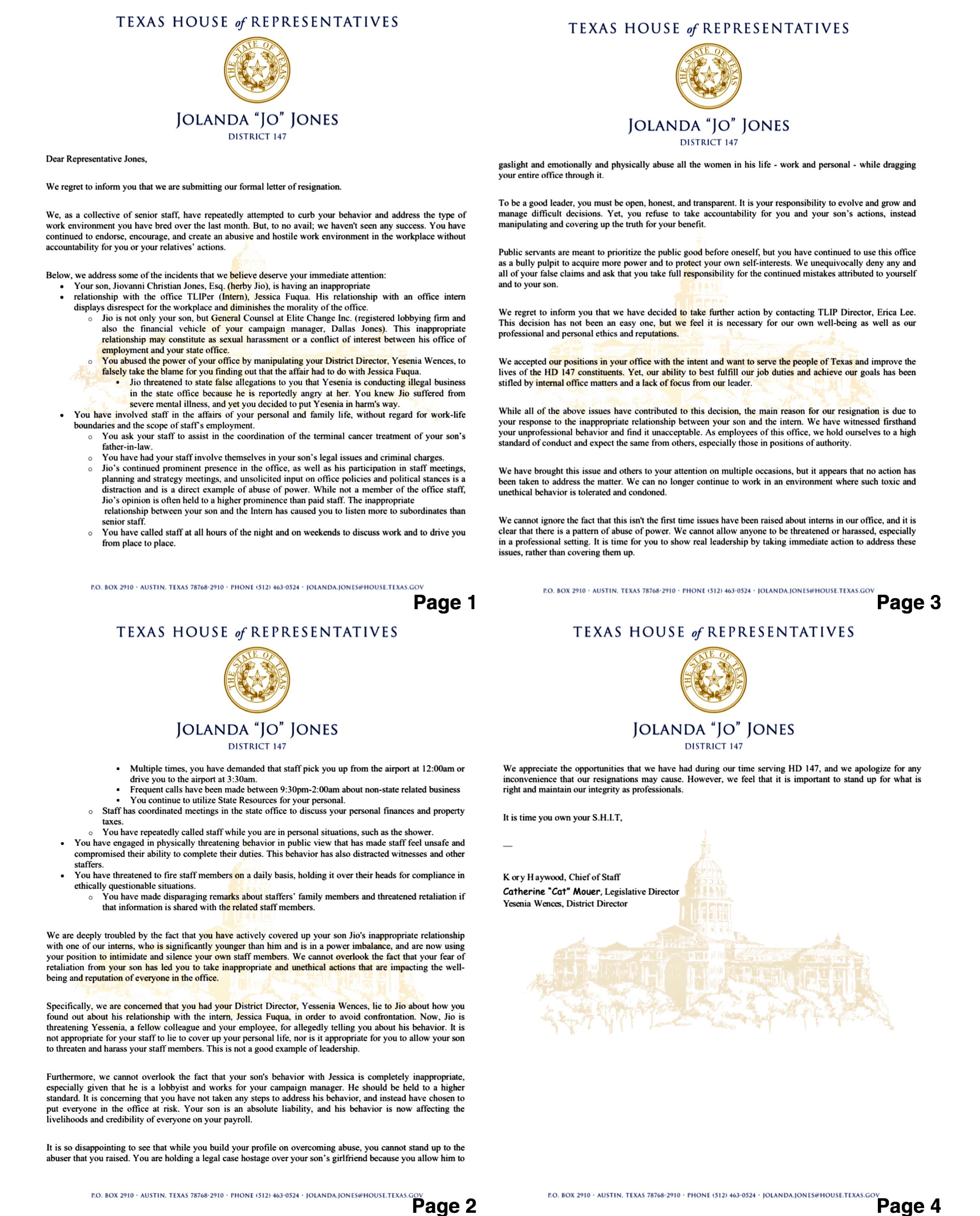 The staff for State Representative Jolanda Jones nuked any hopes of having future careers in politics by resigning in spectacular fashion. A document on official letterhead for House District 147 began circulating Thursday, with many people saying the document is tantamount to the Black Declaration of Independence.