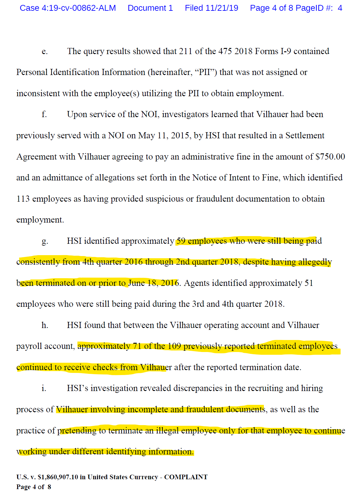 In November 2019, the U.S. government filed a criminal forfeiture lawsuit in the Eastern District of Texas against Vilhauer Enterprises, seizing $1.8 million from company accounts as alleged proceeds from harboring undocumented immigrants. The suit sought nearly $2 million total.