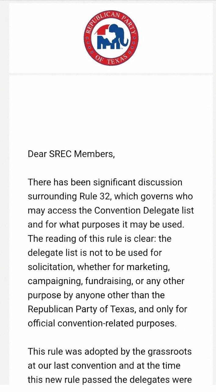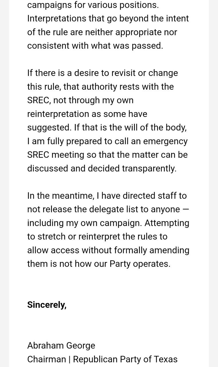 In an email sent by Republican Party of Texas Chairman Abraham George to State Republican Executive Committee Members, George states that he won’t be sharing the delegate list with anyone but himself and his staff: