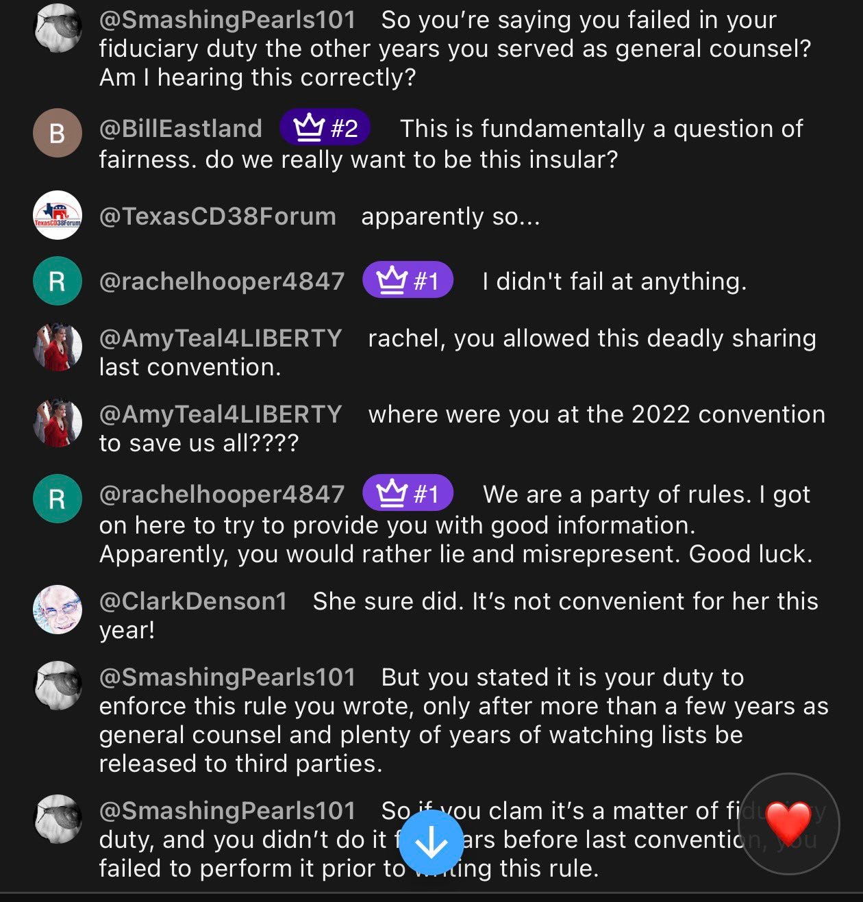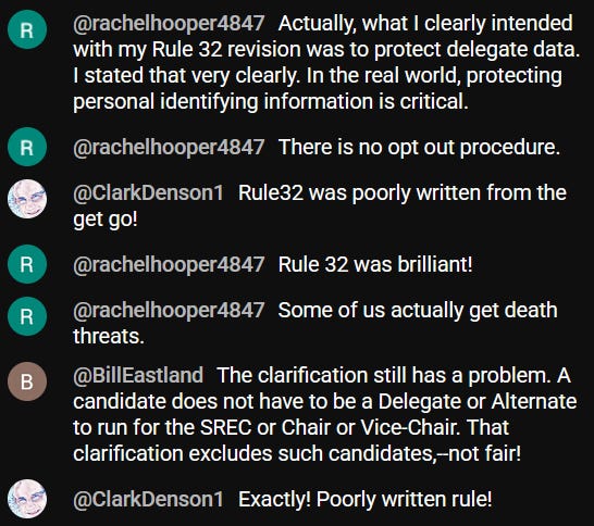 In one comment, Hooper admitted that her involvement and influence in the party rule changes was partially due to her allegedly receiving death threats and refers to the revision as “my Rule 32 revision.”: