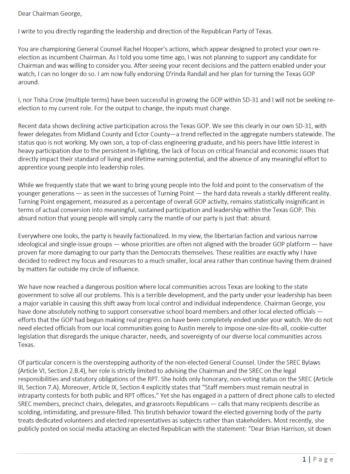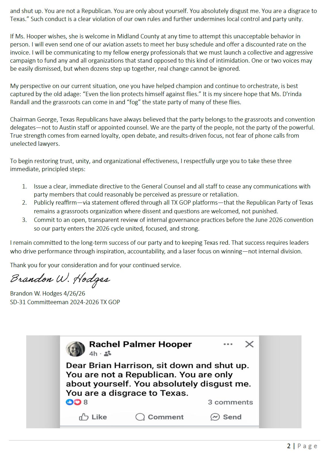In a letter to Republican Party of Texas (RPT) Chairman Abraham George, State Republican Executive Committee (SREC) member Brandon Hodges said he no longer supports the chairman, citing concerns that include the conduct of RPT General Counsel Rachel Hooper.