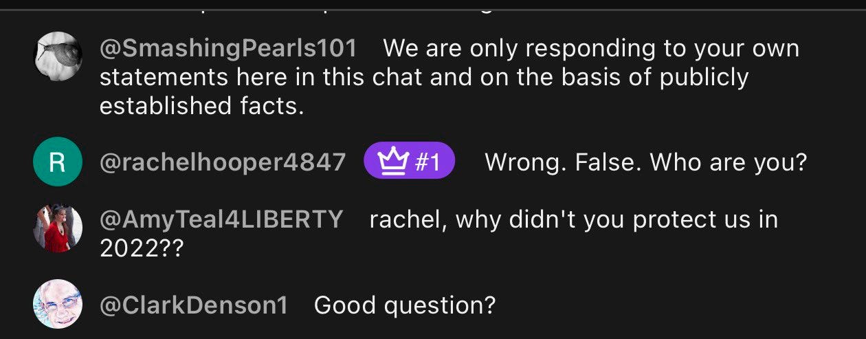 In a SREC meeting streamed to YouTube earlier this week, Hooper (rachelhooper4847) engaged in arguments with viewers in the steam’s live-chat: