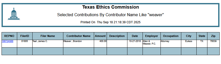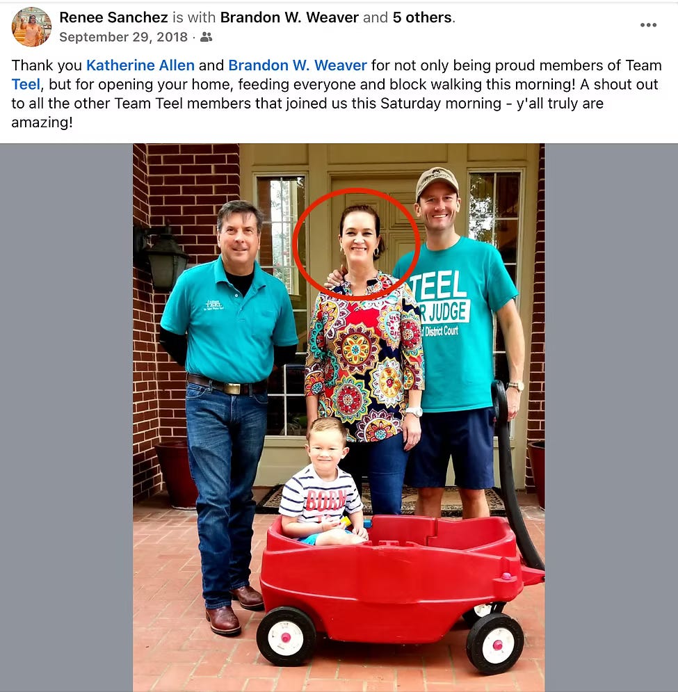 Additionally Katherine Allen Weaver’s husband, who she has a law firm with, donated $400 in 2018 to a Democrat judge who ran against Republican Judge Alex Kim.
