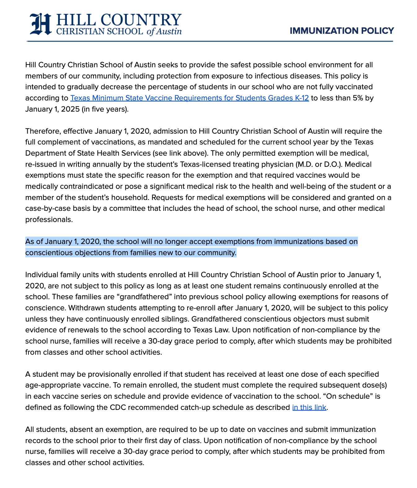 According to a tip from a reader, Hill County Christian Academy in Austin is still mandating vaccines for its students and not allowing any sort of exemptions.