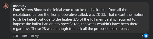 Despite Chairman Abraham George, the RPT as a whole, and most of the SREC threatening reps with ballot removal all year, the threats came up empty as not a single rep was removed from the ballot. A massive failure by the party.