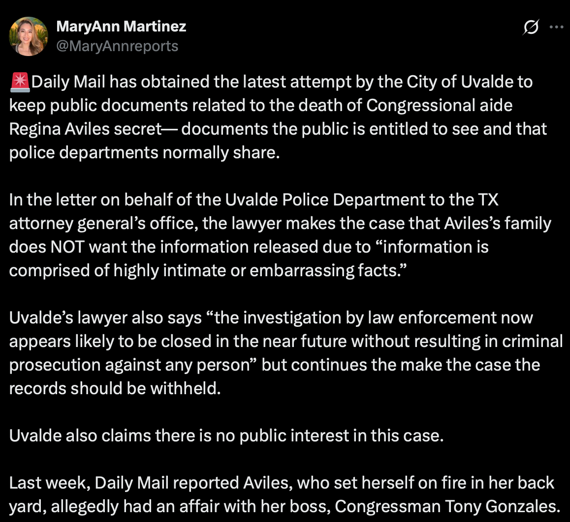 As we continue to monitor the situation surrounding the death of the staffer for congressman Tony Gonzales, a new update comes from MaryAnn Martinez of The Daily Mail.